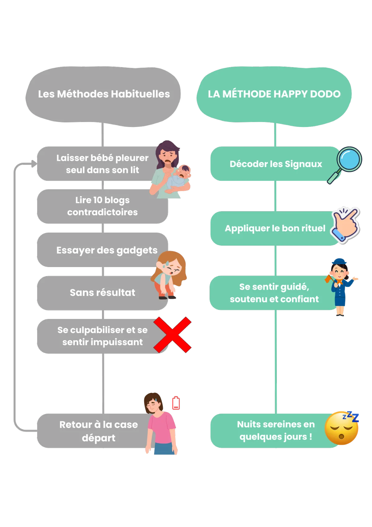 "Je refusais les méthodes dures où il faut laisser pleurer son bébé. Avec Happy Dodo™, j’ai trouvé une approche douce, respectueuse et efficace. Ma fille s’endort paisiblement… et moi aussi." – Sophie, maman de Léa