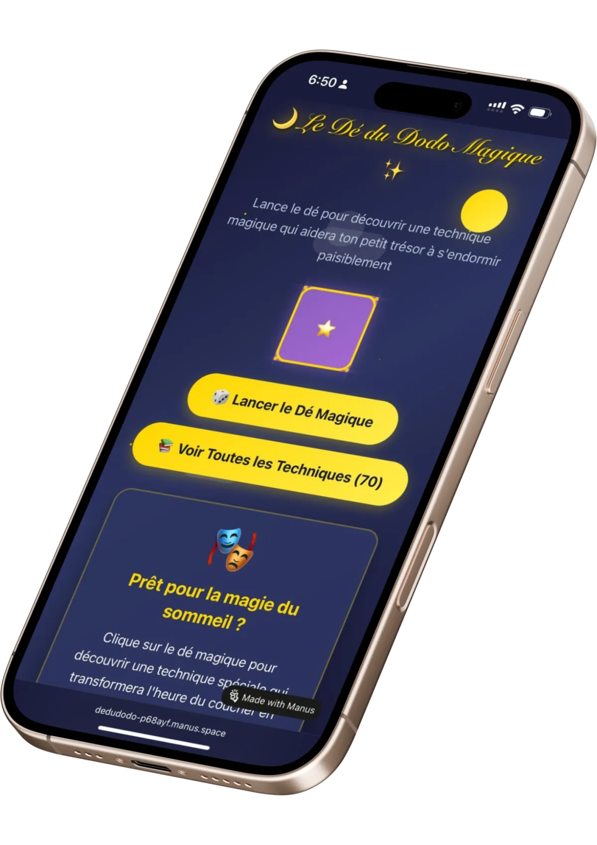 Le Dé du Dodo Magique™, c’est votre joker anti-crise : 70 idées simples et efficaces pour apaiser, endormir ou rendormir votre enfant. Lancez le dé… et appliquez une nouvelle astuce testée et validée par des mamans épuisées comme vous !